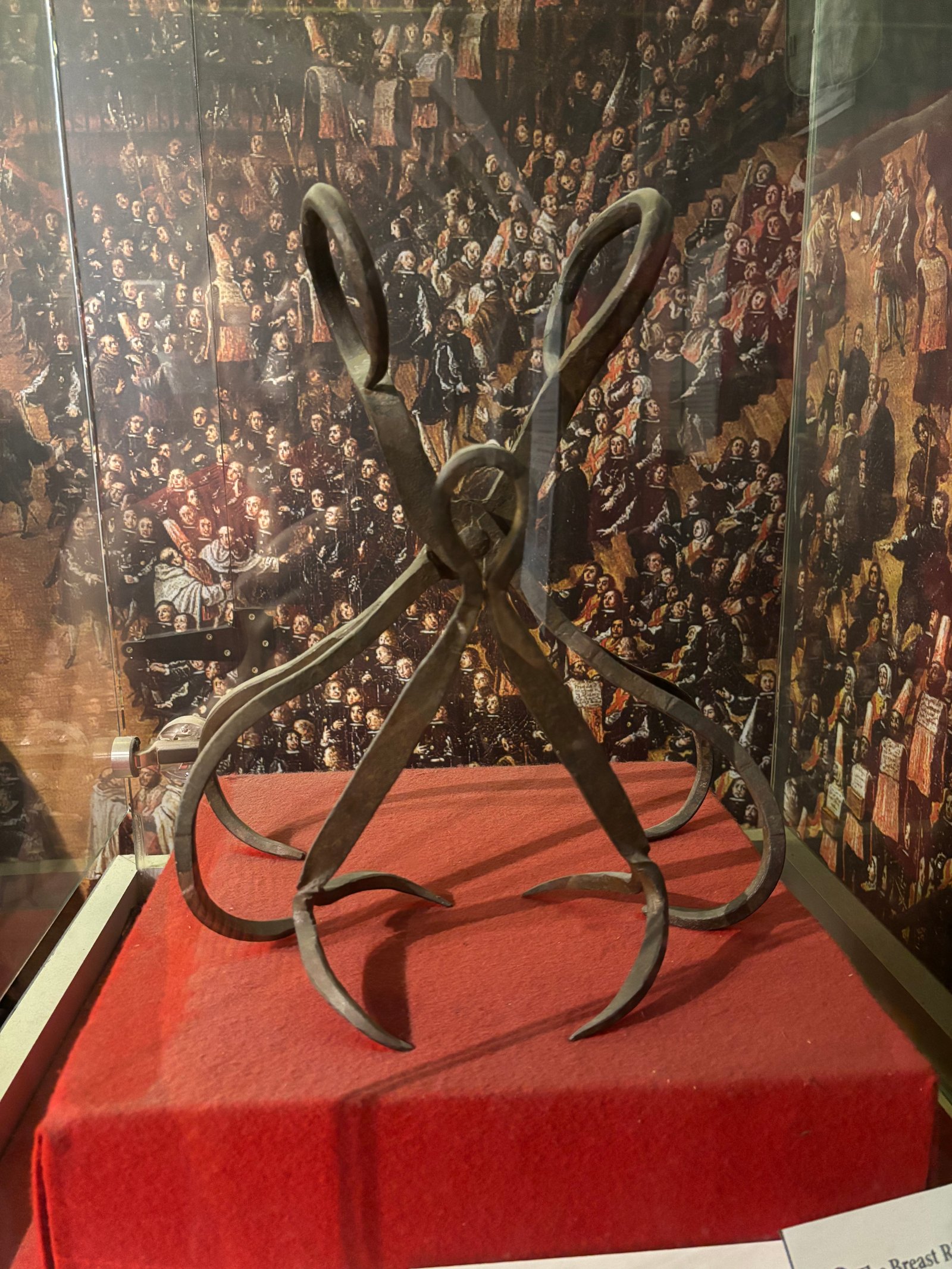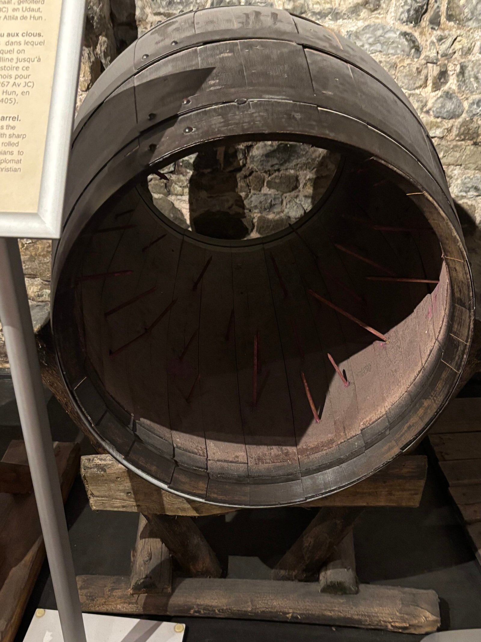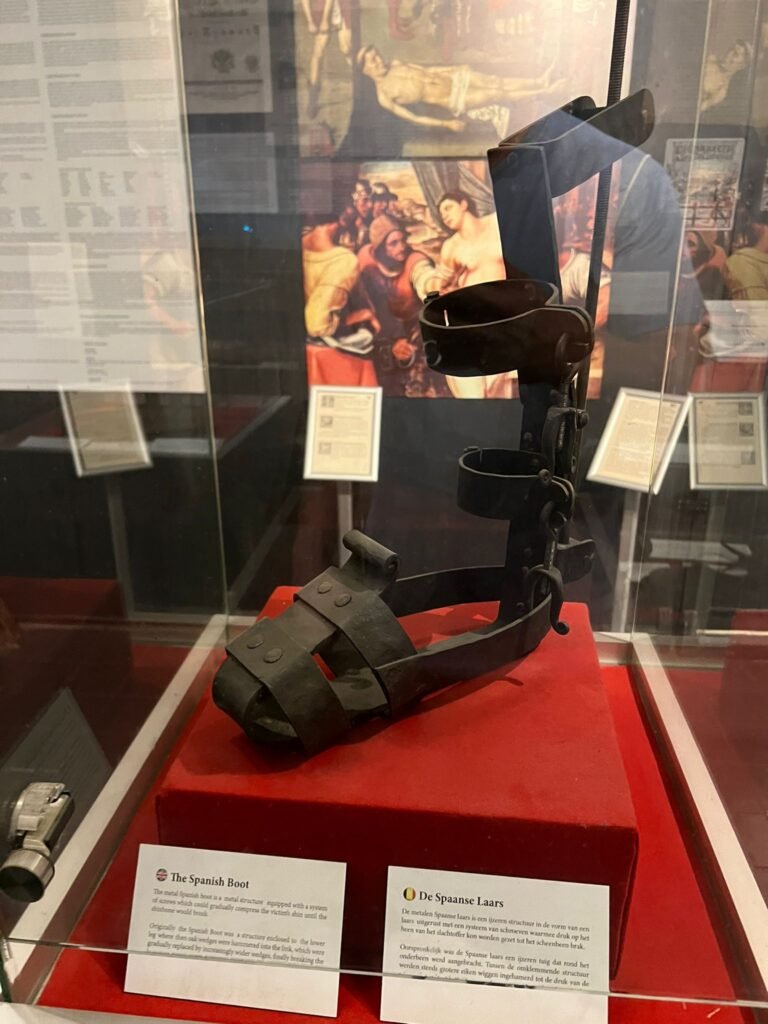 De folterstoel, een verschrikkelijk folterinstrument destijds. Handen, armen en benen werden vastgemaakt waarna tot 1500 pinnen het lichaam werden ingedrukt. Soms werd onderaan de stoel een vuur gemaakt zodat het slachtoffer heftig ging bewegen door de verbranding. Het diende om mensen spontaan te laten bekennen. Ook zaken waar ze geen weet van hadden. Een soort van Zaanse Verhoormethode, zeg maar.