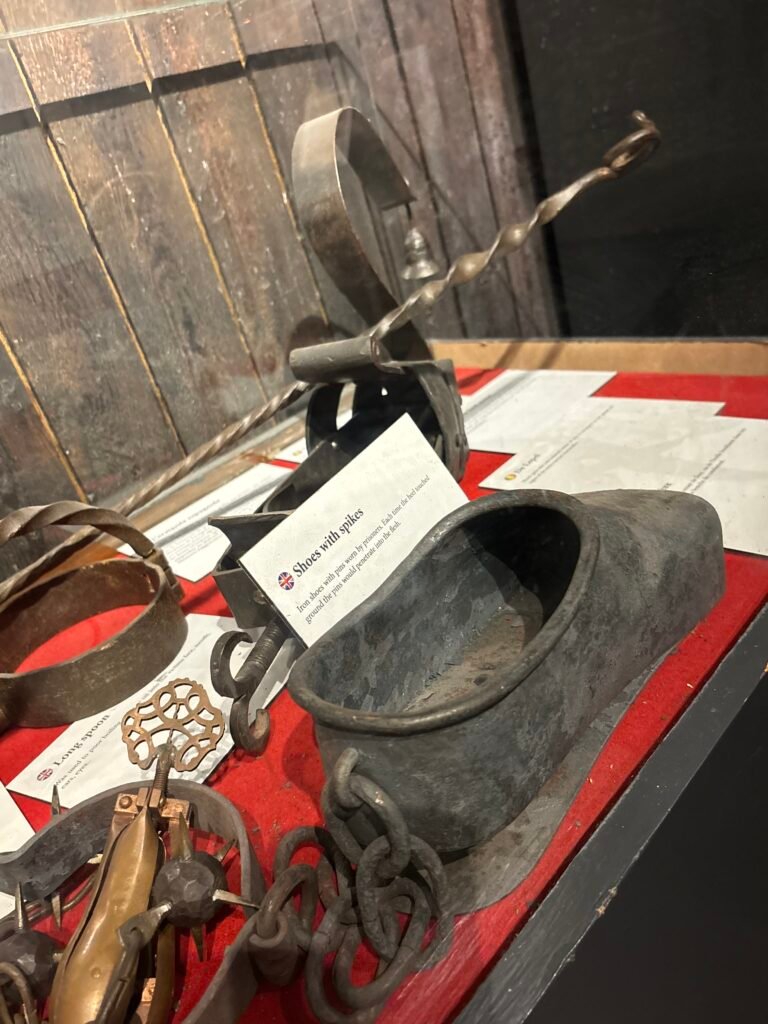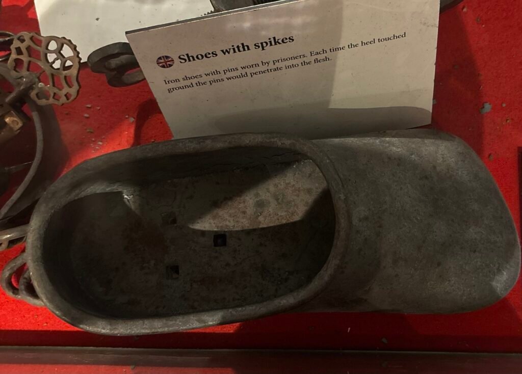 De Middeleeuwse variant van de Crocs, ijzeren schoenen met scherpe pinnen aan de binnenzijde. Telkens wanneer de hiel de grond raakte, werden de spijkers in de voet geduwd en dat maakte het lopen zo ondraaglijk. Niet bepaald schoenen van Van Haren.